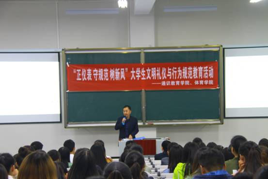 2016年10月19日,幼儿师范学院、体育学院全体学生在校12205演播厅开展了“正仪表 守规范 树新风”为主题的大学生文明礼仪与行为规范教育活动启动仪式。校相关领导,学生处、党政办、校团委相关负责人,学院党政领导及老师出席和参加了此次启动仪式。